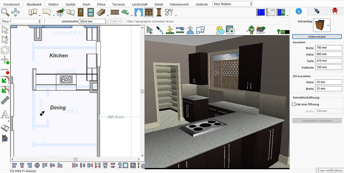 Nachdem Sie einen Schrank für Ihre Küche ausgewählt haben, wird er an der Stelle angezeigt, an der Sie ihn platzieren.