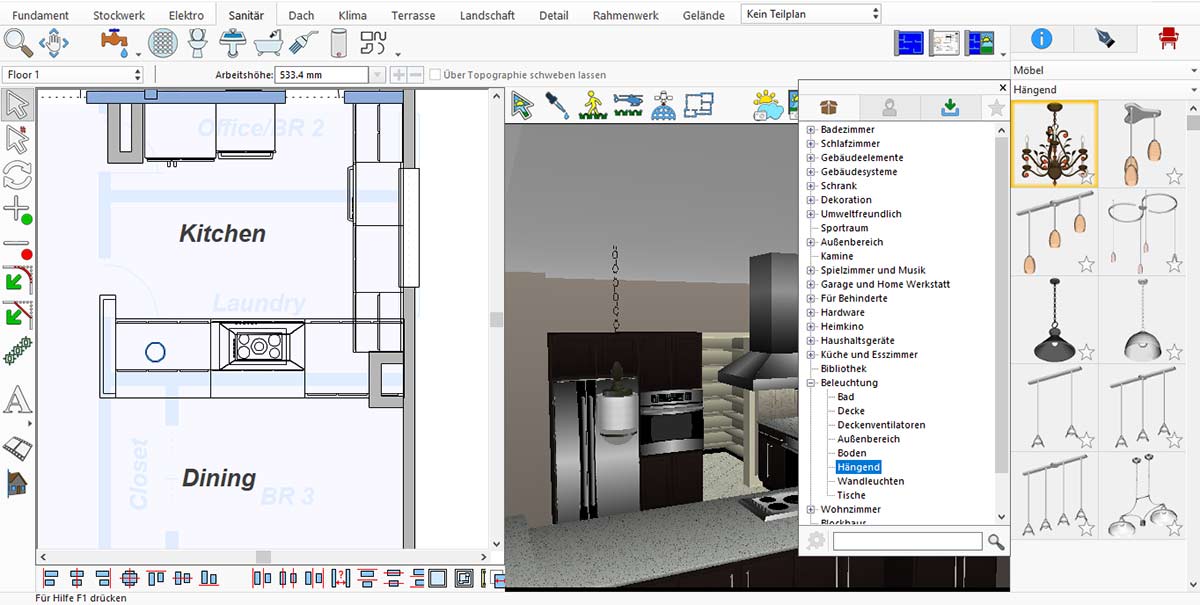 Beleuchtung ist in einer modernen Küche unverzichtbar. Um moderne Leuchten hinzuzufügen, gehen Sie zu Objekte in Bestandsbibliotheken anzeigen > Beleuchtung > Hängend.