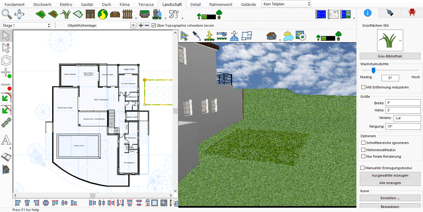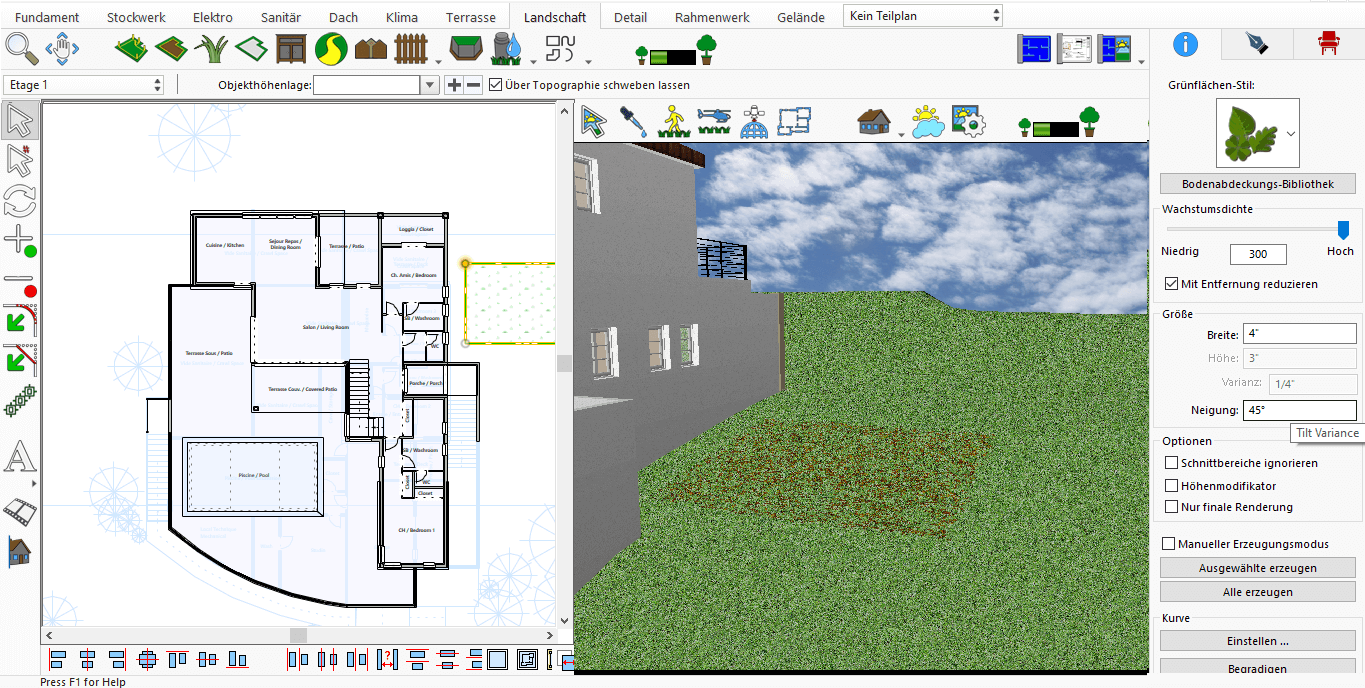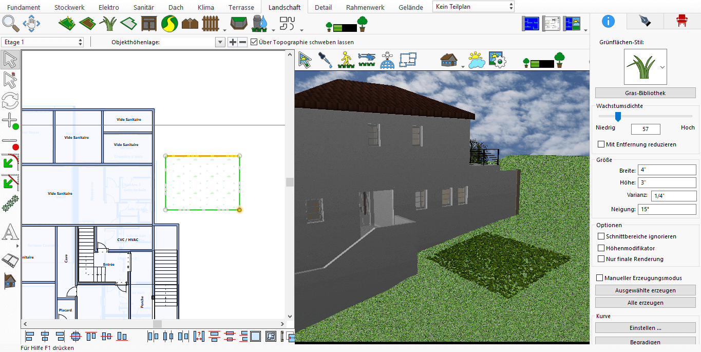 Mithilfe der Funktion Grünfläche können Sie Rasen, trockene Blätter und ähnliche Elemente einfügen, um offene Flächen besonders attraktiv und erfrischend zu gestalten. Die Nutzung dieser Funktion ist äußerst einfach: Sie wird im 2D-Bereich angewendet, das Endergebnis kann jedoch in 3D betrachtet werden, um ein realistischeres Erlebnis zu erhalten.